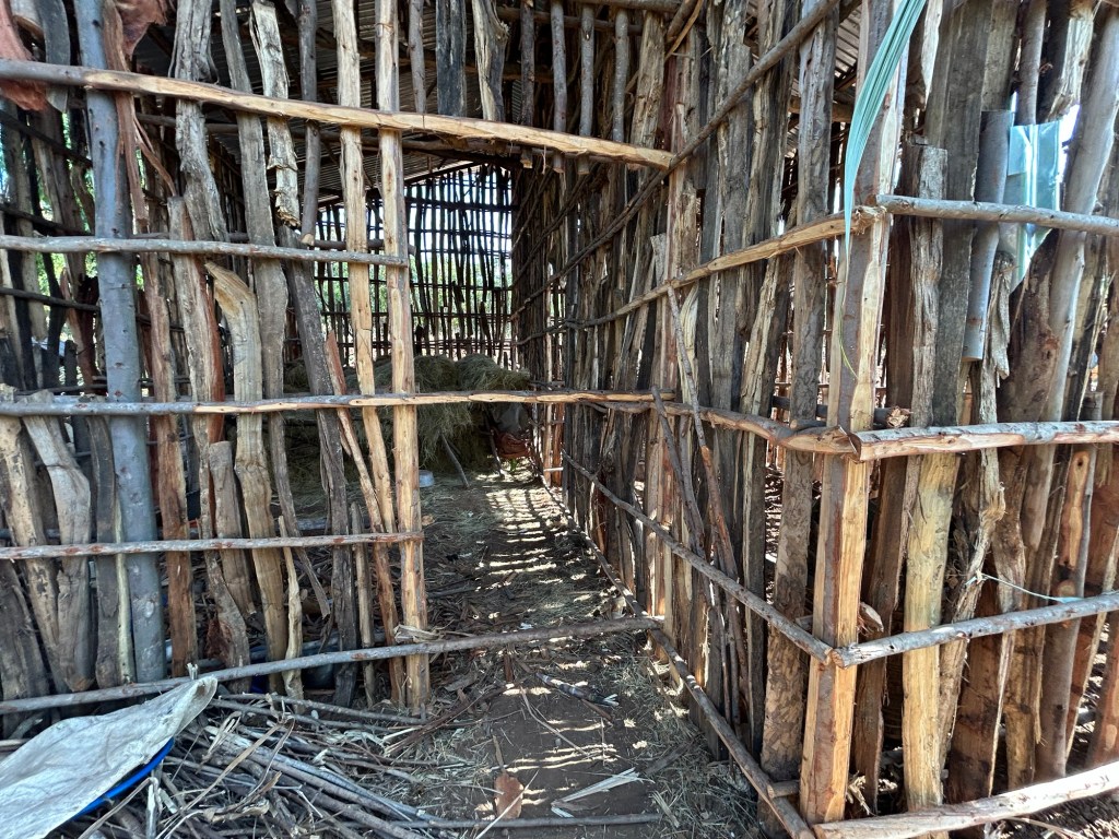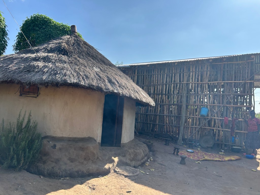 The photo is of her smaller round (kitchen) hut and the larger stick building is the house we prayed over. Typically these houses are a work in progress and eventually are covered in mud and painted.